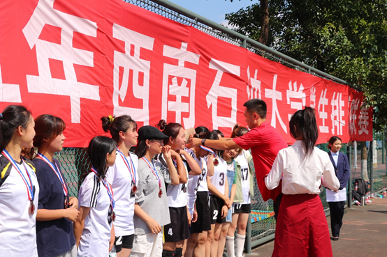 賽后,閉幕式如期舉行。由譚雅文老師宣布比賽名次,體育學院團總支書記劉雨鑫、副院長石金亮和楊光老師為獲獎隊伍頒發獎杯與獎牌,并合照留念。