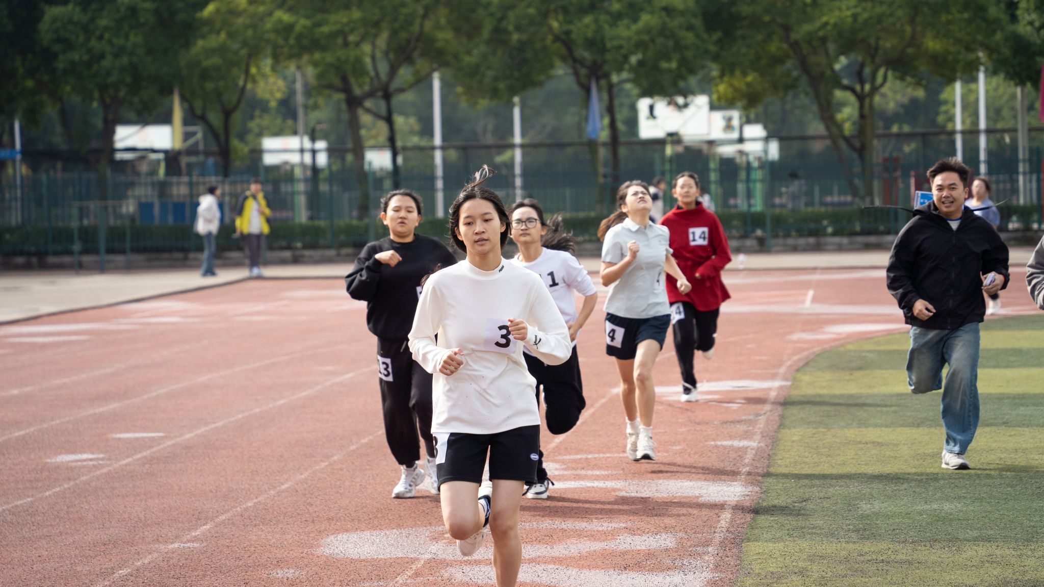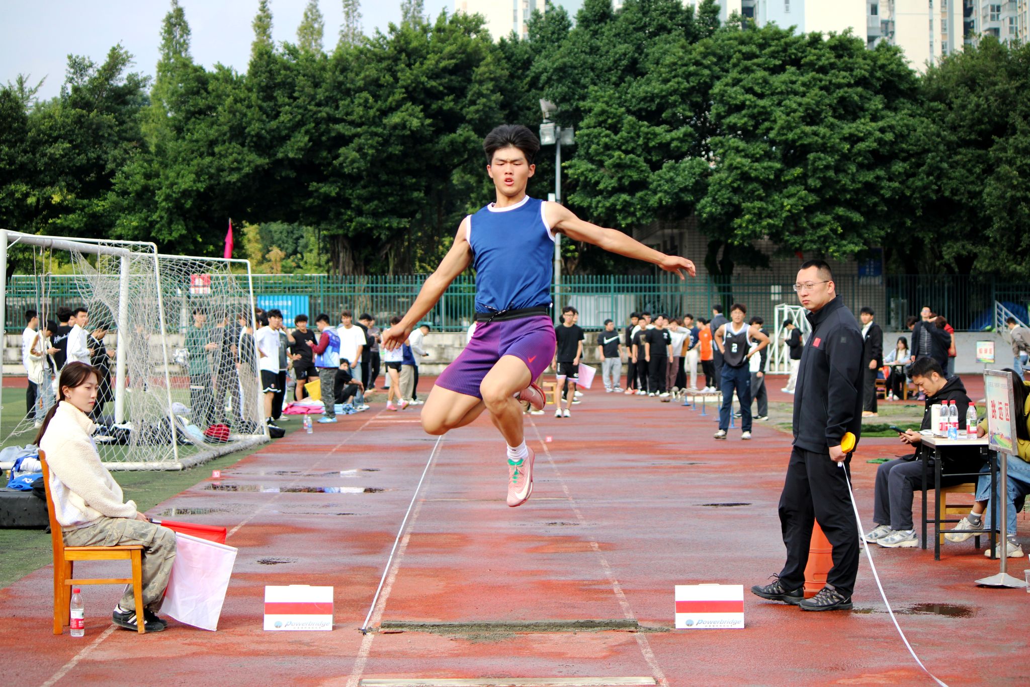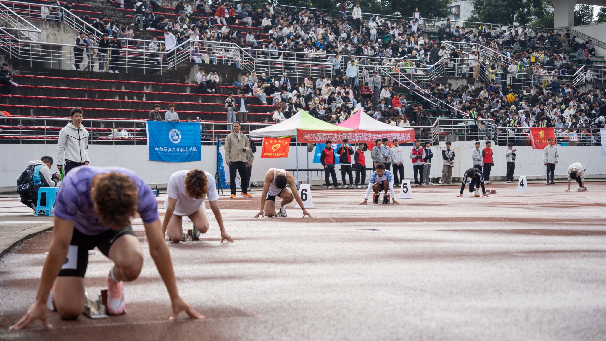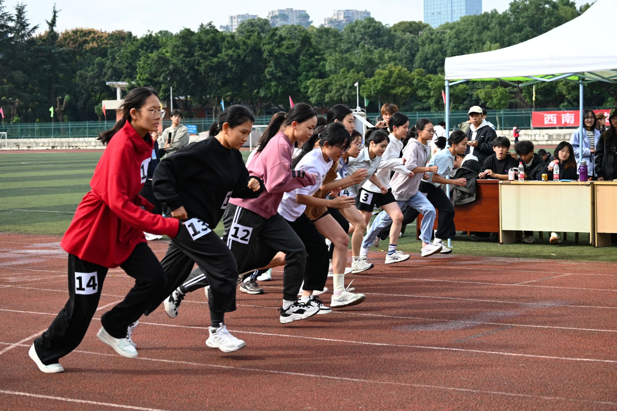 本次運動會分為甲乙兩組,體育學院本科生、研究生劃為乙組,其他14個學院學生劃為甲組。比賽項目有100米、400米、800米(女生)、1500米(男生)、4×100米接力、鉛球、跳高、跳遠。