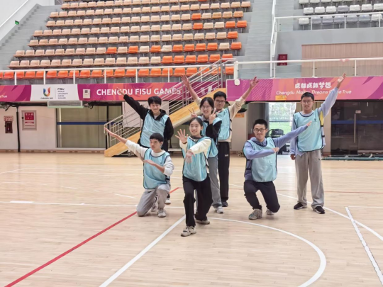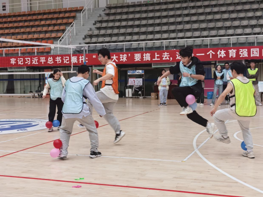 “心靈播種”環節中,同學們寫下困擾投入搜集箱中。分組環節以抽取號碼紙條形式展開,各小組展示了獨特的隊名、造型與口號。“聽數抱團”游戲則讓同學們在跑動中快速組隊,現場一片歡聲笑語。“森林迷霧尋球記”里,參賽隊員戴眼罩轉5圈后在隊友指引下放置乒乓球并接力,考驗團隊協作。“密語傳遞行”通過信息傳遞作畫,展示創意。“心靈解壓氣球賽”則腳綁著氣球,踩爆他人氣球,盡情釋放壓力。