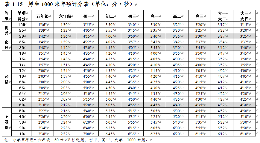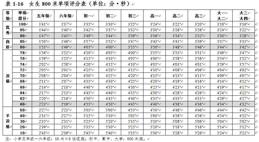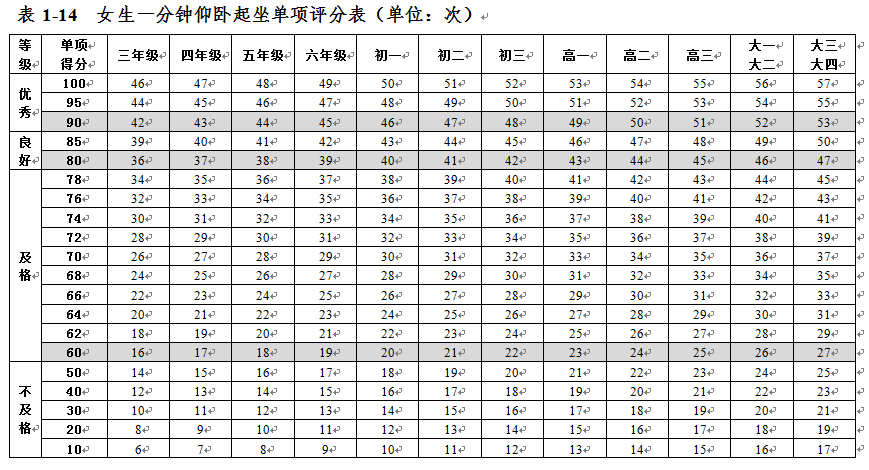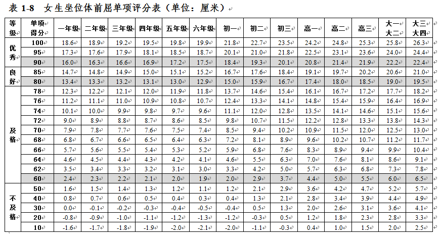大學生體質健康測試各項指標評分表