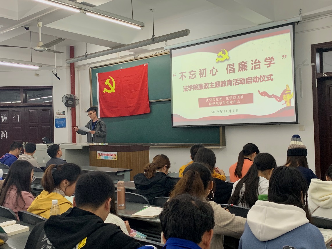 為扎實(shí)推進(jìn)“不忘初心、倡廉治學(xué)”主題教育工作,促進(jìn)學(xué)生干部錘煉拒腐倡廉的政治品格,營造風(fēng)清氣正的學(xué)院環(huán)境,11月7日晚上七點(diǎn),由法學(xué)院黨委主辦,法學(xué)院團(tuán)委、法學(xué)院學(xué)生黨建中心承辦的“不忘初心,倡廉治學(xué)”—法學(xué)院廉政主題教育系列活動(dòng)在思學(xué)樓A311拉開帷幕,法學(xué)院黨委副書記、紀(jì)委書記于百江出席,學(xué)院全體黨員、團(tuán)學(xué)干部等150余人參與。