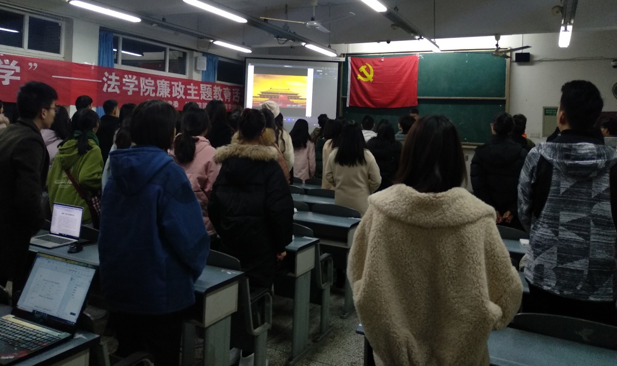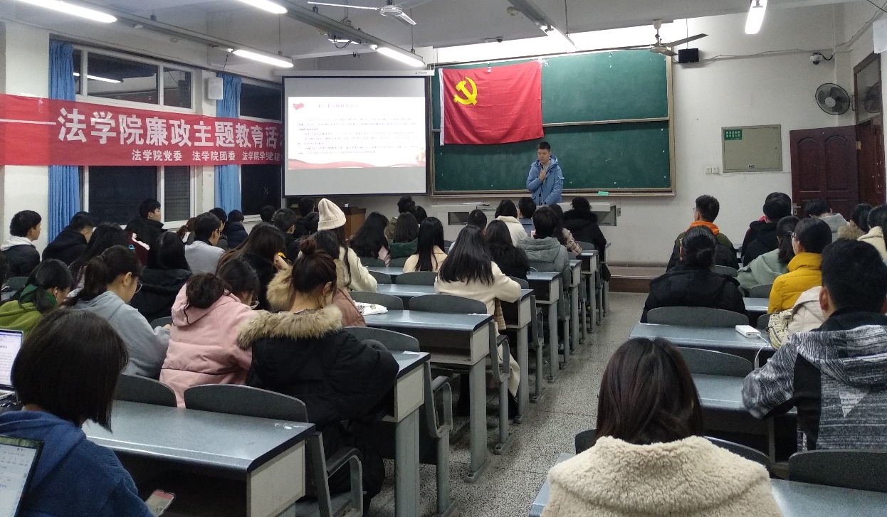 為扎實推進“不忘初心、倡廉治學”主題教育工作,促進學生干部錘煉拒腐倡廉的政治品格,12月19日晚上七點,由法學院黨委主辦,法學院團委、法學院學生黨建中心承辦的“不忘初心,倡廉治學”—法學院廉政主題教育系列活動結項儀式在博學樓B307順利開展,法學院學生黨員、團學干部、入黨積極分子等人積極參與。