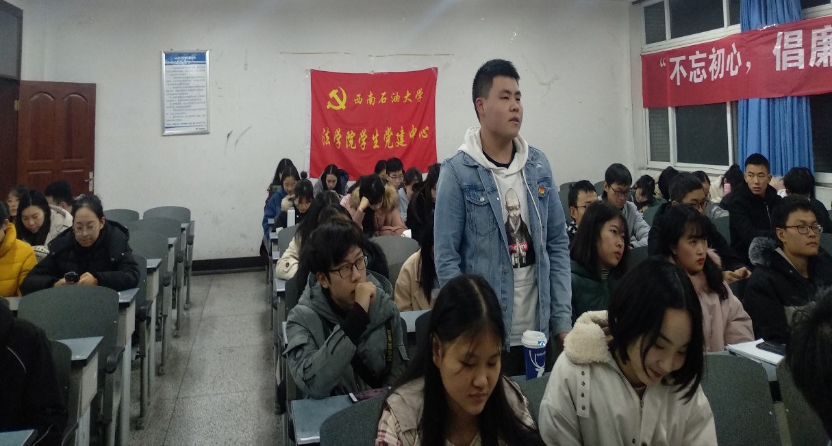 在頒獎結束后,法學院團委學生會干部以及18級、19級的班級班委發表了自己對法學院本次開展的”不忘初心,倡廉治學”主題教育活動的心得體會,并就自身的現實情況說明了自己將如何在學習和生活中貫徹“不忘初心,倡廉治學”這一崇高理念。