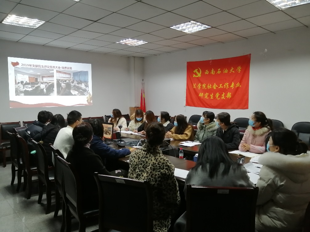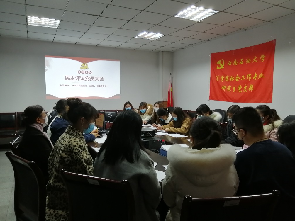 12月24日晚19:30,法學院社會工作專業研究生黨支部在博學樓AB510召開2020年支部民主評議黨員大會,會議由支部書記汪佳材同志主持,法學院黨委委員、副院長譚祖雪老師臨場指導,支部全體黨員參與。