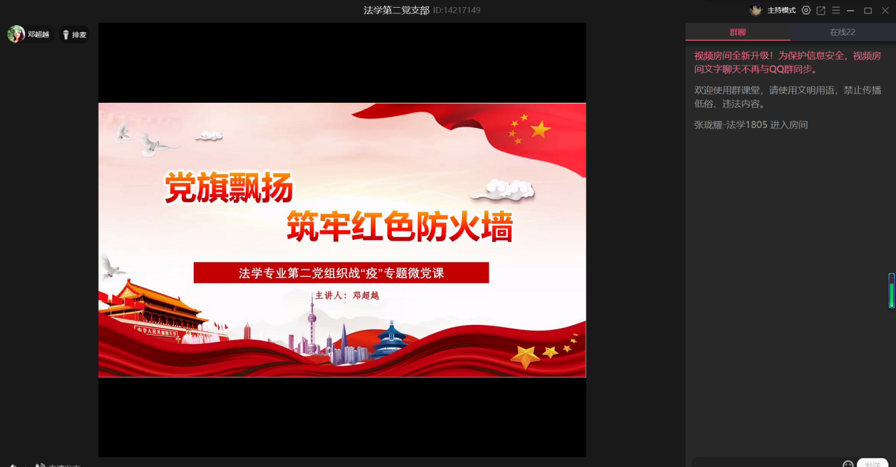 為貫徹落實加強高校基層黨建“四個一”行動方案,2020年6月24日,法學院法學專業學生第二黨支部舉行了以“黨旗飄揚,筑牢紅色防火墻”為主題的專題微黨課。此次黨課的目的在于引領帶動支部加強基層黨建工作,進一步激發青年黨員的責任感,在這個沒有硝煙的疫情防控戰場沖鋒陷陣,充分發揮黨員先鋒模范作用,自覺當先鋒、作表率,帶頭落實防控措施,用行動展現共產黨員的精神風范。會議由支部書記鄧超越老師主講,全體黨員積極參與。