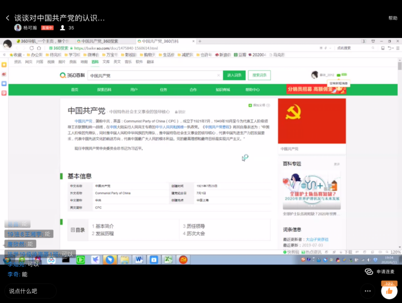 中國共產黨是中國工人階級的先鋒隊,我們想要加入共產黨就必須對黨有一定的認識。第一次討論的主題就是“談談對中國共產黨的認識”,在楊可瀚老師的引導和講解下,各小組隨后在小組內進行了討論,組內學員都結合在黨課中學習到的知識,針對該主題發表了自己的看法,然后各組內推選代表在班內對討論結果進行了分享,分享結束后,楊可瀚老師對疫情中黨員的先鋒模范事例進行了講解,讓同學們通過實際的例子更加深入的理解了中國共產黨和作為中國共產黨員應該承擔的責任。