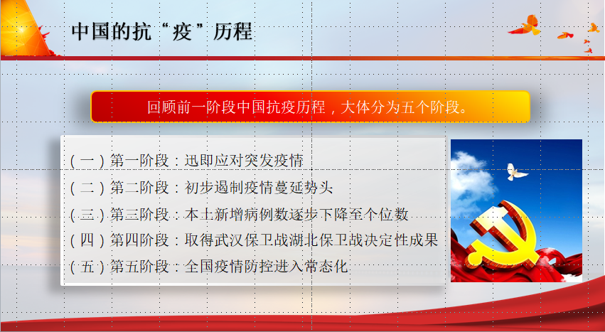 本次活動圍繞中國的抗“疫”歷程、凝聚全國攜手抗“疫”,共同構建人類衛生健康共同體和解讀疫情防控的最新部署四個內容展開。黨課伊始,我們共同回顧中國抗擊疫情的全過程。肖丹老師講到,新冠肺炎疫情是新中國成立以來發生的傳播速度最快、感染范圍最廣、防控難度最大的一次重大突發公共衛生事件,對中國是一次危機,也是一次大考。中國共產黨和中國政府高度重視、迅速行動,習近平總書記親自指揮、親自部署,統攬全局、果斷決策,為中國人民抗擊疫情堅定了信心、凝聚了力量、指明了方向。