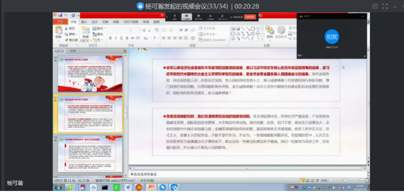 隨后,楊老師帶領(lǐng)同志們觀看了聚焦兩會的視頻。其中,政府工作報告簡短精煉地總結(jié)了去年和今年的政府工作,明確了今年的主要目標任務(wù),一組組數(shù)據(jù)是對中國發(fā)展歷程最有力的注腳。“兩高”報告數(shù)據(jù)表明社會治理進入新階段,人民群眾對社會發(fā)展內(nèi)涵的新期待。透過數(shù)據(jù),我們看到的是正按下加速鍵,向著未來高速發(fā)展的中國。
