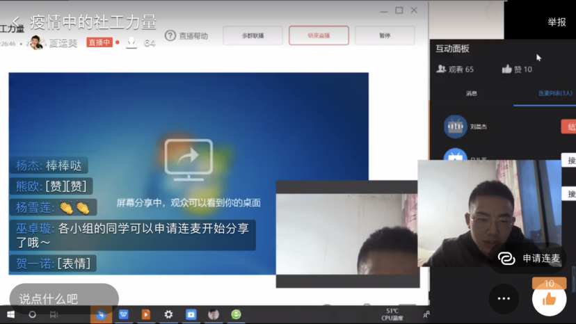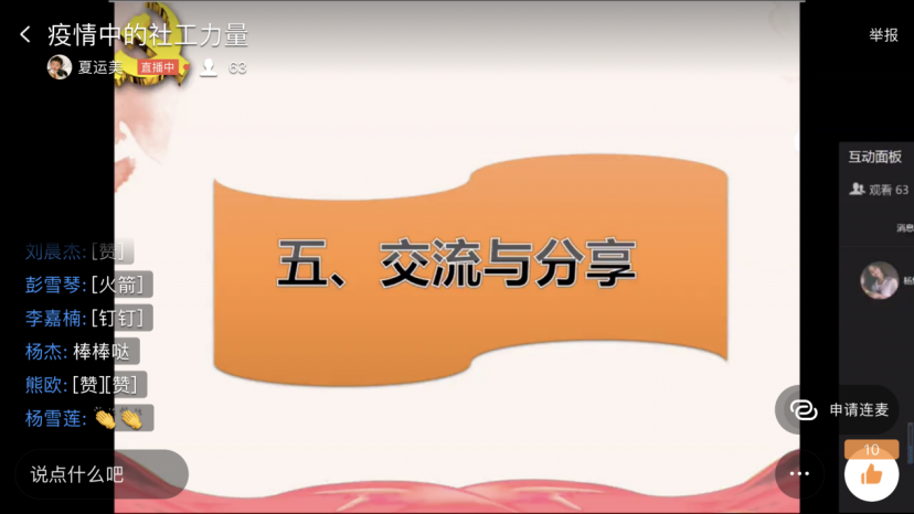 疫情抗擊戰,高校在行動。本次組織生活討論到高校社工團體在疫情中所發揮的作用。抗疫至今,不少高校組織學生團隊進行志愿者幫扶,精心策劃了心理、學習、文娛生活等不同主題的系列活動,幫助疫情下的民眾更好地調整心態,積極面對,共渡難關。高校不僅積極響應“停課不停學”號召,組織學生開展線上教學,同時還充分發揮高校的社會服務功能,關注民生,大力宣傳疫情防護知識,配合國家做好疫情防控。