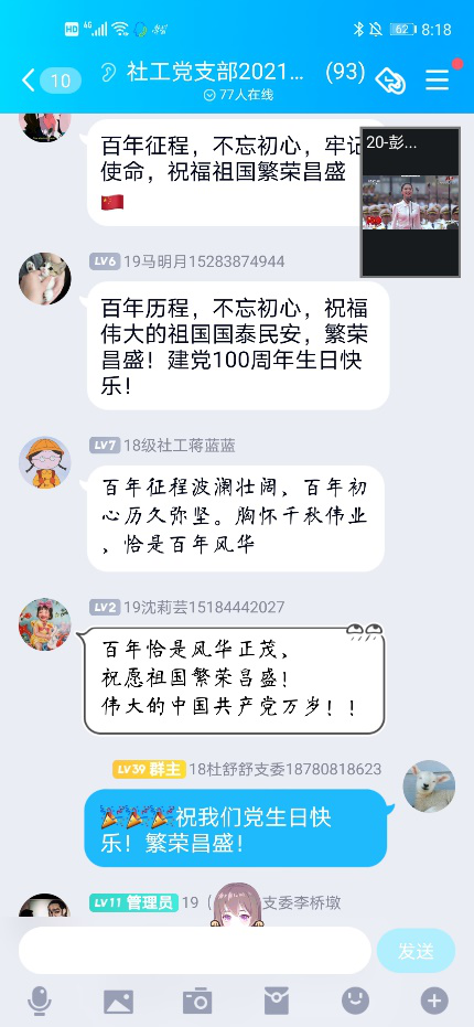 2021年7月1日是中國共產黨誕辰100周年,百年來,黨帶領全國人民譜寫了中華民族自強不息、頑強奮進的壯麗史詩。為了熱烈慶祝中國共產黨成立100周年,深入開展黨史學習教育,在“七一”建黨節到來之際,社工黨支部組織全體黨員、積極分子在線上QQ群通過錄屏的方式集中觀看了建黨100周年慶祝大會直播,共計黨員、積極分子49人參與。