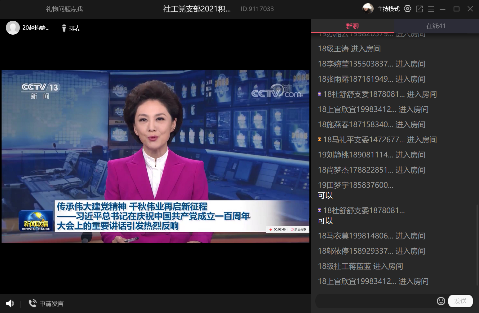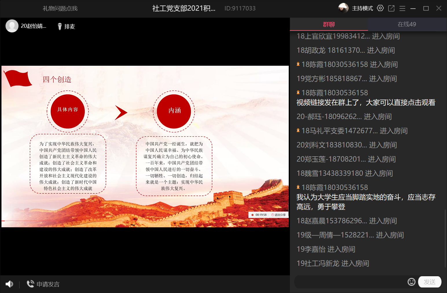 百年征程波瀾壯闊,百年黨史鑄就輝煌。為深入學習貫徹偉大建黨精神,厚植紅色基因,帶領支部全體成員明初心、堅信念、擔使命,社工黨支部于2021年7月18日15時在線上開展了“‘光輝歷程,偉大成就’——學習習近平總書記在慶祝中國共產黨成立100周年上的重要講話”主題黨組織生活活動。本次活動分為:學理論、強素質;讀金句、談體悟;勤討論、學思想三個環節,黨支部全體同志積極參與,反響熱烈。
