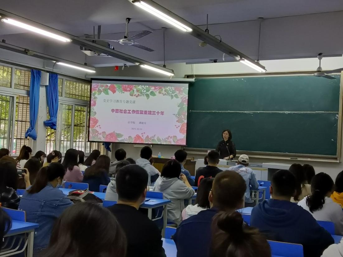 為深入開展黨史學(xué)習(xí)教育,引導(dǎo)青年學(xué)生堅(jiān)定理想信念和信仰信心,2021年10月14日下午法學(xué)院黨委又一堂生動(dòng)的黨史課在博學(xué)樓B101開展。黨課的主講人為法學(xué)院副院長譚祖雪同志主講題目為《中國社會(huì)工作恢復(fù)重建三十年》。她所聯(lián)系的社會(huì)工作專業(yè)本科生、社工研究生黨支部的全體黨員和入黨積極分子參加了本次會(huì)議。