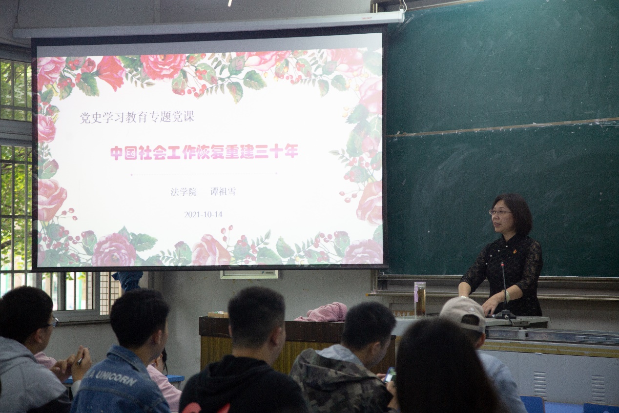 2021年10月14日下午15:00,法學院副院長譚祖雪老師于博學樓B101為社工黨支部的全體成員開展了黨史學習教育專題黨課。本次黨課在學習四史的大背景下,以“中國社會工作恢復重建30年”為主題,讓黨員同志和入黨積極分子們進一步了解國家社會治理能力與中國現代化進程,深化對中華人民共和國史和改革開放史的認識與理解。