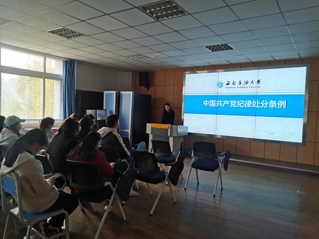 會上,黨支部負責人肖丹老師帶領大家逐條學習了《中國共產黨問責條例》和《中國共產黨紀律處分條例》,并對問責條例原則和黨員廉潔自律規范進行了深入解讀。整場主題教育活動由條例學習、案例分析和黨員討論三個部分組成。