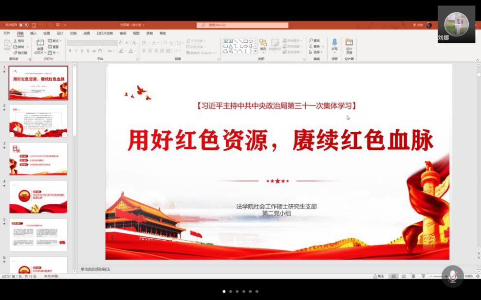 社會工作研究生黨支部于11月11日下午2:30開展“用好紅色資源,賡續紅色血脈”主題線上黨組織生活會,對習近平總書記在中共中央政治局第三十一次集體學習中的重要講話進行學習。本次黨組織生活會由社會工作專業研究生黨支部書記巫艷麗主持,第二黨小組李金航同志進行分享。
