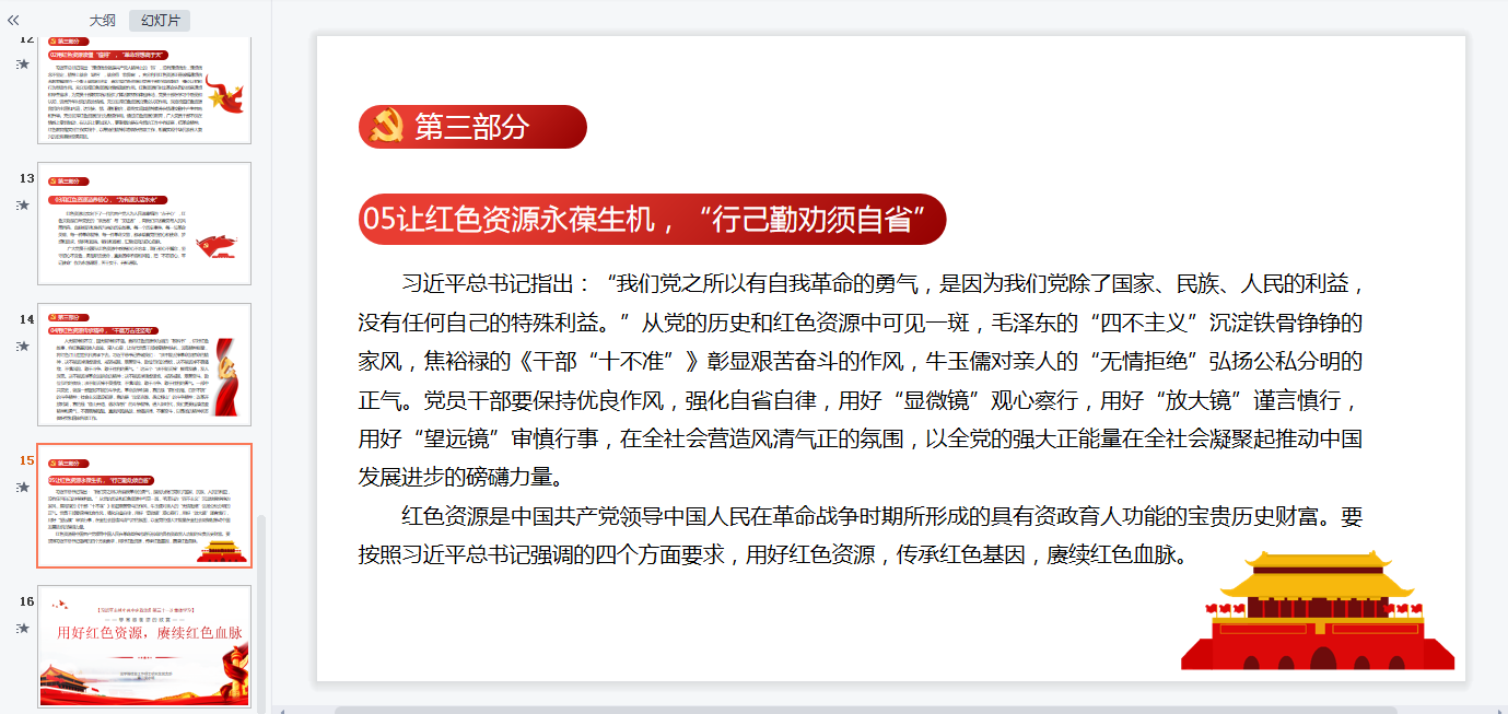 習近平總書記在七一前夕帶領中央政治局同志來到北大紅樓、豐澤園毛澤東同志故居,并發表重要講話,基于此背景李金航同志從“習近平總書記關于紅色資源的重要論斷”、“紅色資源的重要性”、“如何管理好和運用好紅色資源”這三個部分進行分享講解。在“如何管理好和運用好紅色資源”這部分內容的講解中,李金航同志還介紹了四川在此方面的做法以及黨員同志應該如何做等內容。