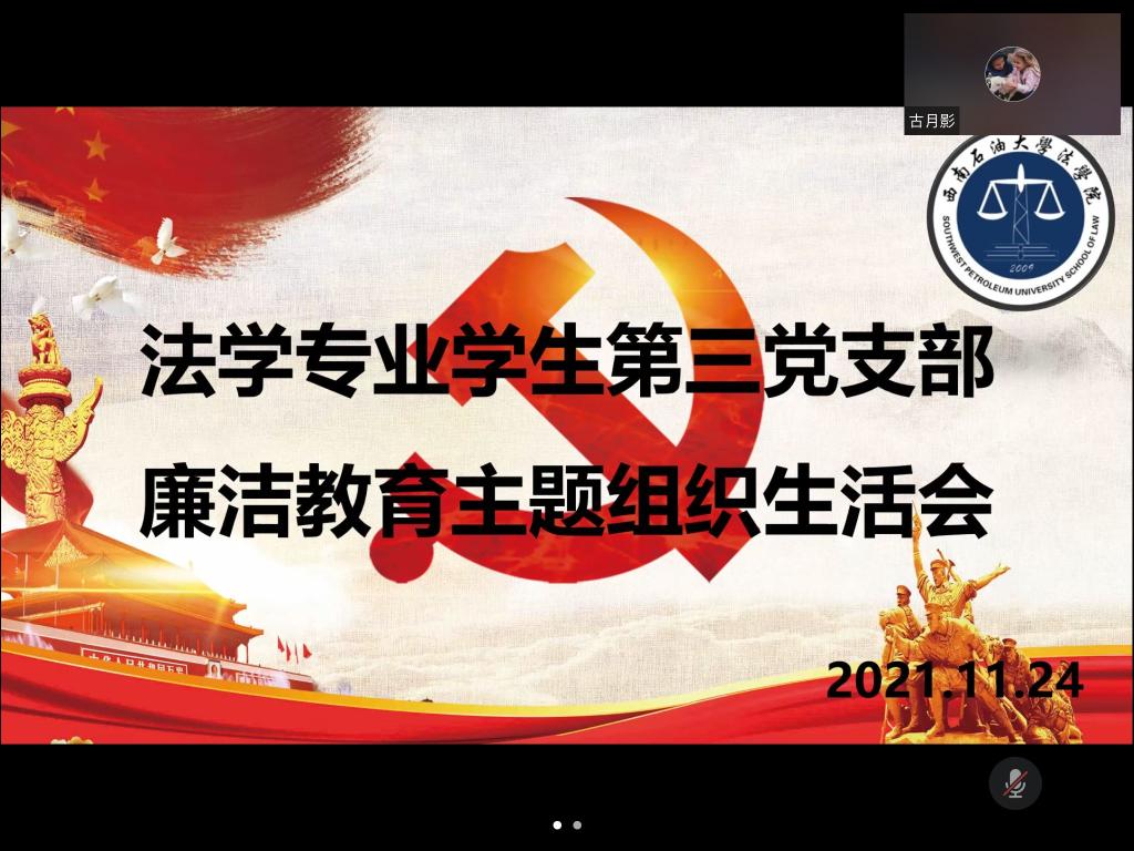 2021年11月24日晚20:00,西南石油大學(xué)法學(xué)院法學(xué)學(xué)生第三黨支部通過騰訊會(huì)議開展了線上會(huì)議,會(huì)議開展了廉潔教育,并圍繞《把權(quán)力關(guān)進(jìn)制度的籠子里——中國共產(chǎn)黨反腐倡廉理論與實(shí)踐》一書進(jìn)行了讀書分享。會(huì)議應(yīng)到15人,實(shí)到15人,黨支部書記平凱同志主持本次會(huì)議,會(huì)議順利召開。