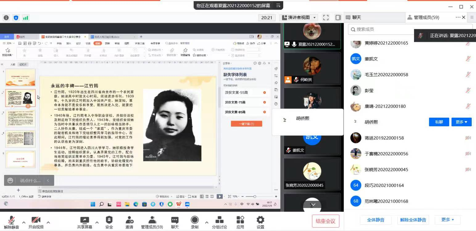 通過讀書分享會,進一步激發了支部成員學黨史、悟思想、開新局的意識,會議成員結合崗位工作和日常生活暢談了各自體會。2021級碩士生姜凱文感悟道要將黨史教育內化于心、增長黨性,外化于行、超越自我,努力將黨史學習教育的成果轉化為服務師生第的根本動力,為中國夢的實現不懈奮斗。2020級碩士生徐小悠則深刻表示我們作為中國共產黨的后備力量,作為重要的接班人。知史才能知今,知今才能開創未來。