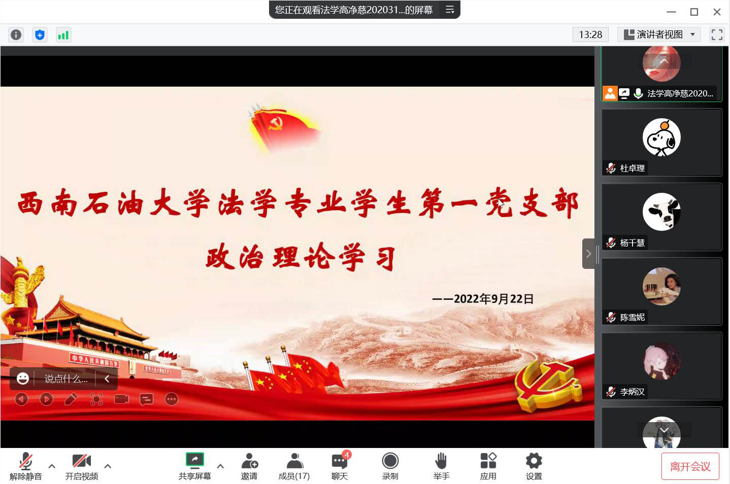 為深入學(xué)習(xí)貫徹習(xí)近平新時(shí)代中國(guó)特色社會(huì)主義思想,貫徹落實(shí)黨的十九屆六中全會(huì)精神,加強(qiáng)黨員教育與理論學(xué)習(xí),推進(jìn)支部建設(shè),法學(xué)專業(yè)學(xué)生第一黨支部于9月22日15時(shí)開(kāi)展線上會(huì)議,進(jìn)行政治理論學(xué)習(xí)。本次會(huì)議由法學(xué)專業(yè)學(xué)生第一黨支部書(shū)記楊可瀚老師和支部委員高凈慈同志主持,支部黨員陳雪妮同志主講,黨支部全體同志積極參與。