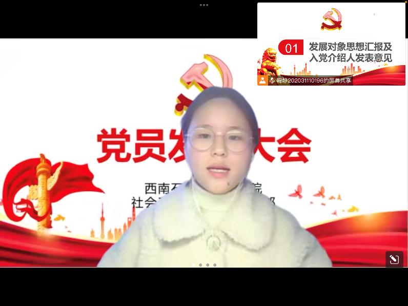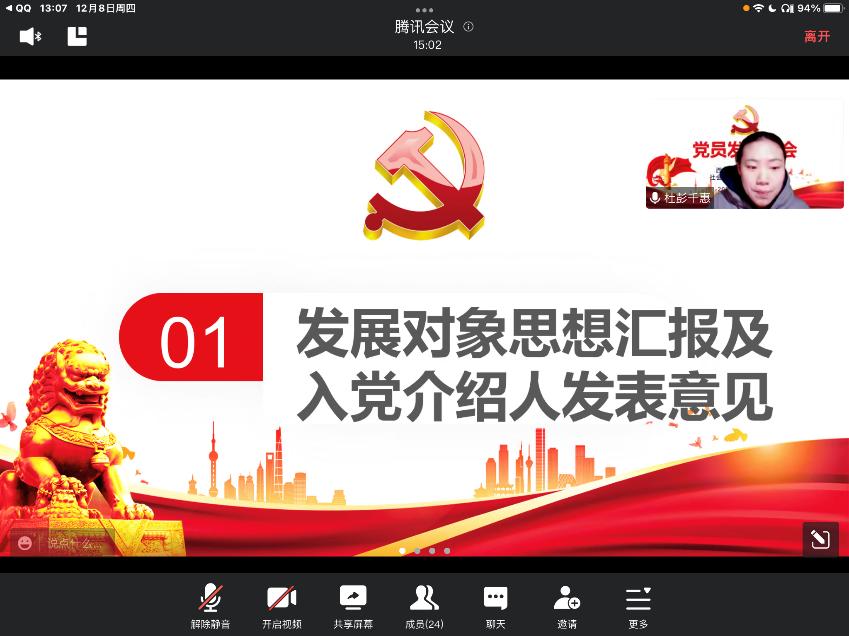 2022年12月8日13時,法學院社會工作專業(yè)學生黨支部于騰訊會議線上召開2022年下半年黨員發(fā)展大會。本次會議圍繞社會工作學生黨支部發(fā)展預備黨員問題進行討論,參加大會的正式黨員11人,預備黨員6人。