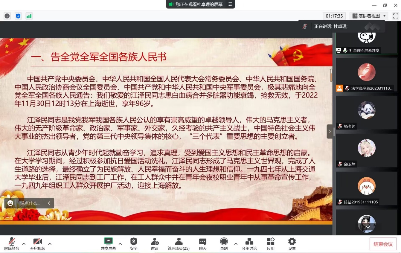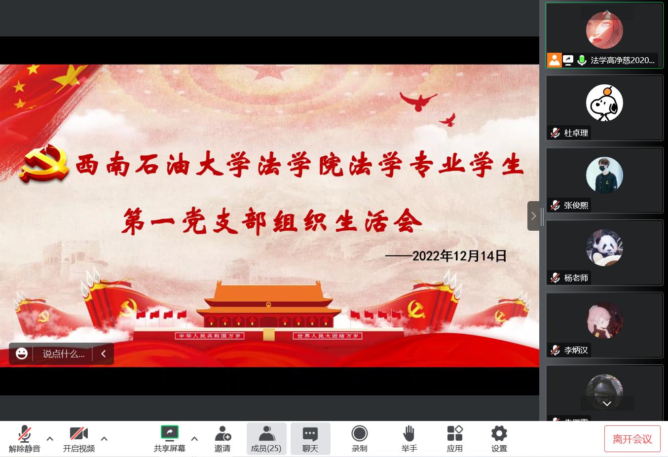 為進一步增強黨員的黨性修養,走好趕考之路,充分發揮黨員的先鋒模范作用,法學院法學專業學生第一黨支部于12月14日14時開展十二月黨組織生活會。本次黨組織生活會以線上騰訊會議形式開展,由法學專業學生第一黨支部黨員高凈慈、杜卓理、朱厚霖三位同志主講,支部全體同志積極參與。