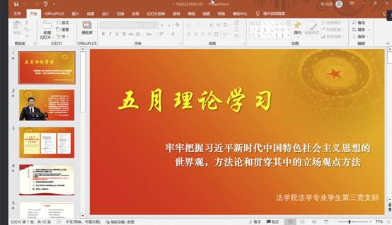 2023年5月31日,法學專業學生第三黨支部在博學樓A406開展學習貫徹習近平新時代中國特色社會主義思想主題教育,本月主題為“牢牢把握習近平新時代中國特色社會主義思想的世界觀、方法論和貫穿其中的立場觀點方法”。會議由陳佳雨同志主持,支部全體同志參與。