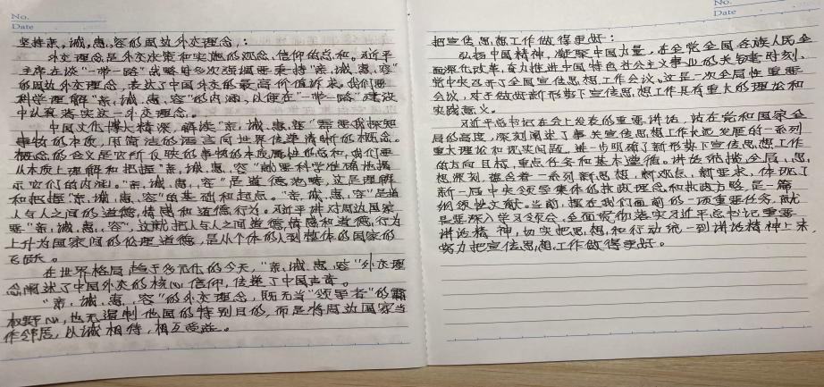本次生活會主要由社會工作黨支部成員分散進行閱讀學習,并完成相應學習記錄與筆記。多名支部同志在筆記中說到,中國堅持對外開放的基本國策,奉行互利共贏的開放戰略,推動高質量共建“一帶一路”,推進全球發展倡議,推動構建全球發展共同體。支持多邊貿易體制,推動建設開放型世界經濟,推動經濟全球化朝著更加開放、包容、普惠、平衡、共贏的方向發展。中國秉持共商共建共享的全球治理觀,積極參與全球治理體系改革和建設,維護以聯合國為核心的國際體系、以國際法為基礎的國際秩序、以聯合國憲章宗旨和原則為基礎的國際關系基本準則,維護和踐行真正的多邊主義,堅決反對單邊主義、保護主義、霸權主義、強權政治。堅持共同、綜合、合作、可持續的安全觀,推動落實全球安全倡議。建設性參與國際和地區熱點問題政治解決,在氣候變化、減貧、反恐、網絡安全和維護地區安全等領域發揮積極作用。
