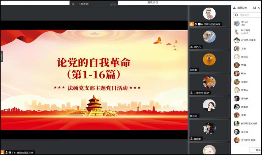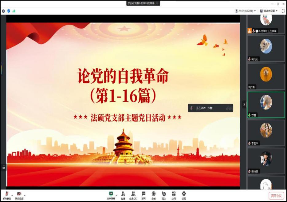 《論黨的自我革命》成為黨支部首要學(xué)習(xí)主題。在深入開(kāi)展學(xué)習(xí)貫徹習(xí)近平新時(shí)代中國(guó)特色社會(huì)主義思想主題教育中,通過(guò)讀原著,學(xué)原文、悟原理,將習(xí)近平新時(shí)代中國(guó)特色社會(huì)主義思想轉(zhuǎn)化為堅(jiān)定思想、錘煉黨性和指導(dǎo)實(shí)踐、推動(dòng)工作的強(qiáng)大力量。為加深支部成員學(xué)習(xí)與理解。支部于2023年7月20日以線上會(huì)議的形式開(kāi)展本次主題教育活動(dòng),教育重點(diǎn)內(nèi)容是論黨的自我革命,本次主題活動(dòng)由黨支部宣傳委員付曉玲主持。