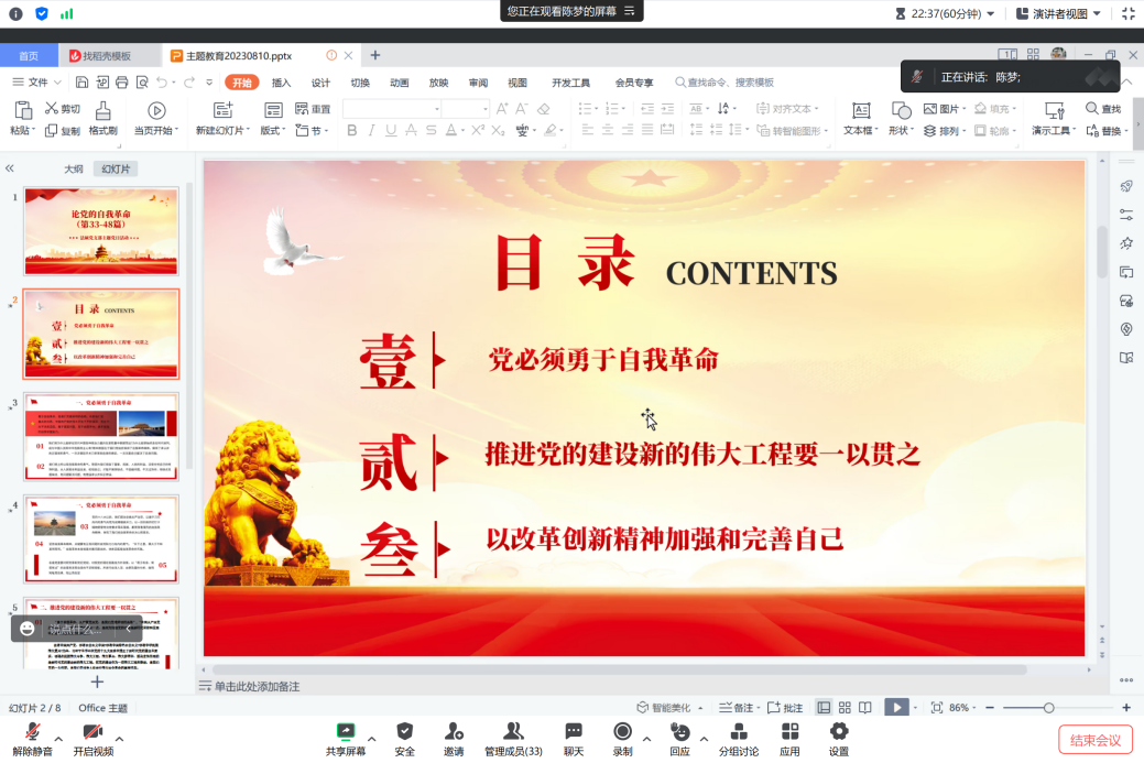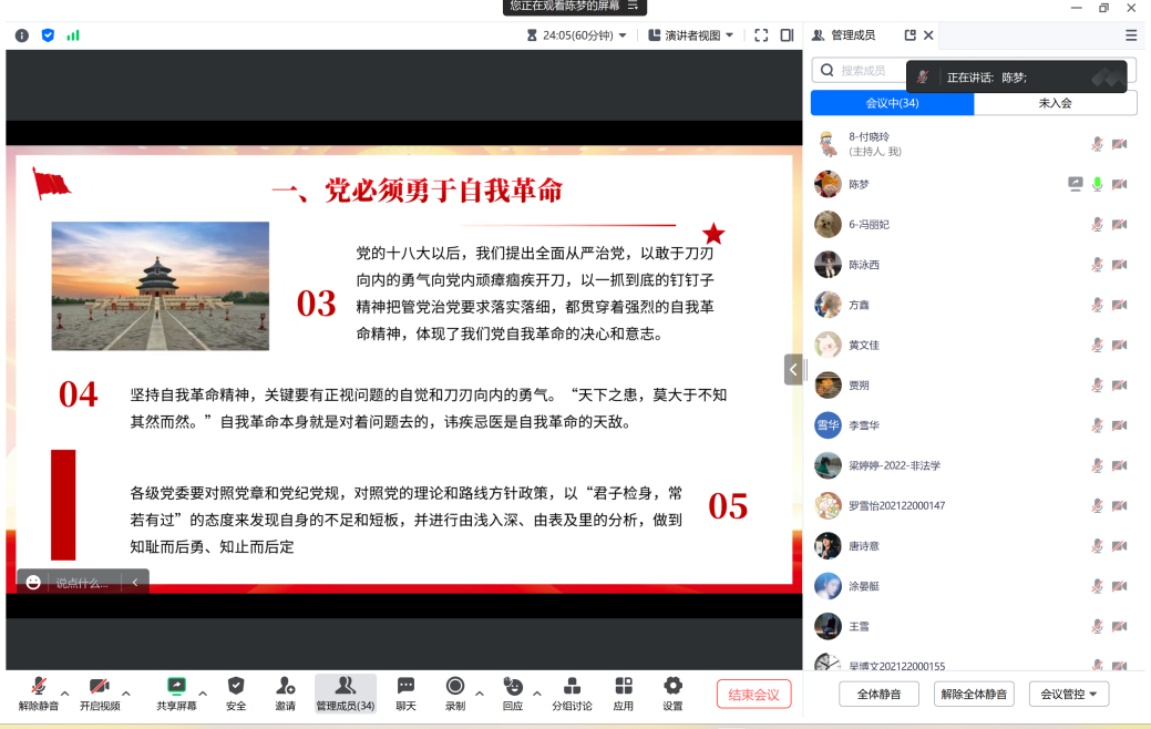 為扎實推進深入開展學習貫徹習近平新時代中國特色社會主義思想主題教育走深走實,進一步增強黨員干部不忘初心、牢記使命、強化擔當、積極作為的意識。2023年8月10日,法碩黨支部以線上會議的形式開展主題為“黨必須勇于自我革命”的集中學習。本次主題活動由黨支部副書記陳夢主持。