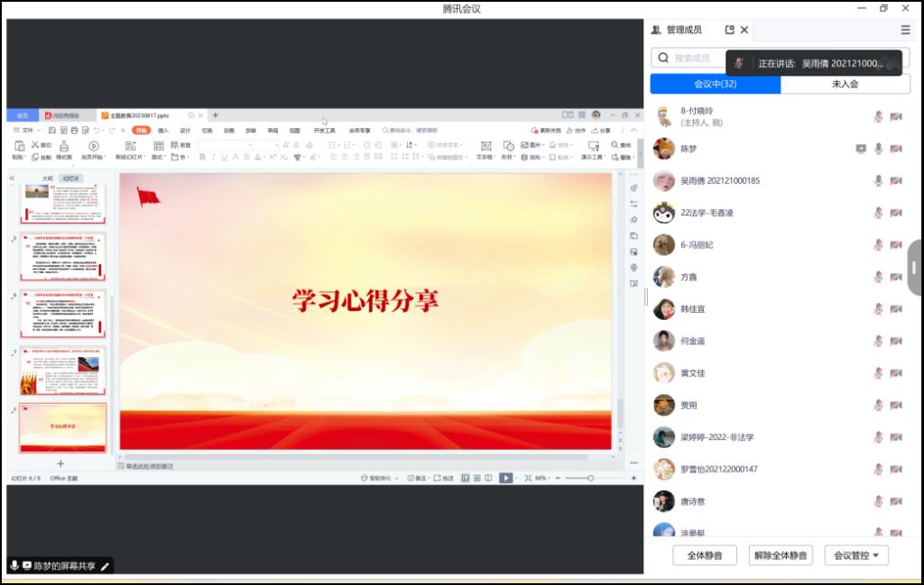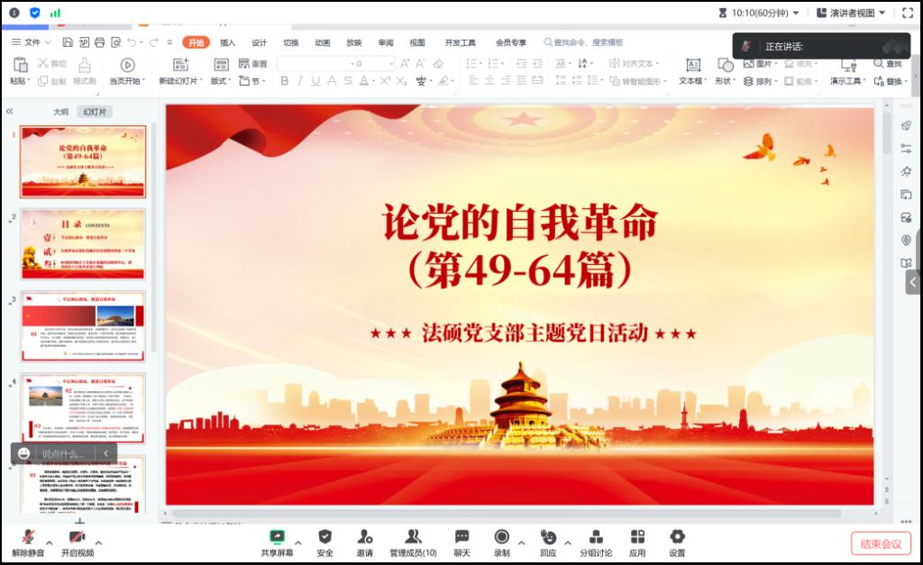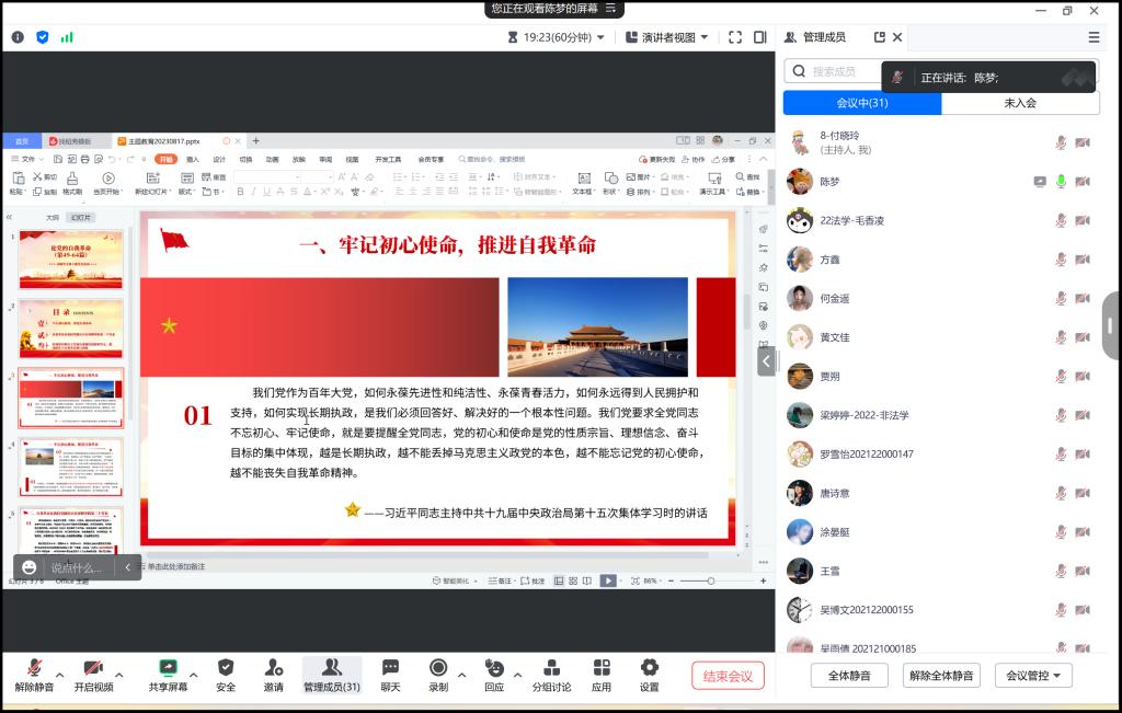 不忘初心、牢記使命,說到底是要解決黨內存在的違背初心和使命的各種問題,關鍵是要有正視問題的自覺和刀刃向內的勇氣。2023年8月17日,法碩黨支部以線上會議的形式開展主題為“牢記初心使命,推進自我革命”的集中學習,本次主題活動由黨支部副書記陳夢主持。