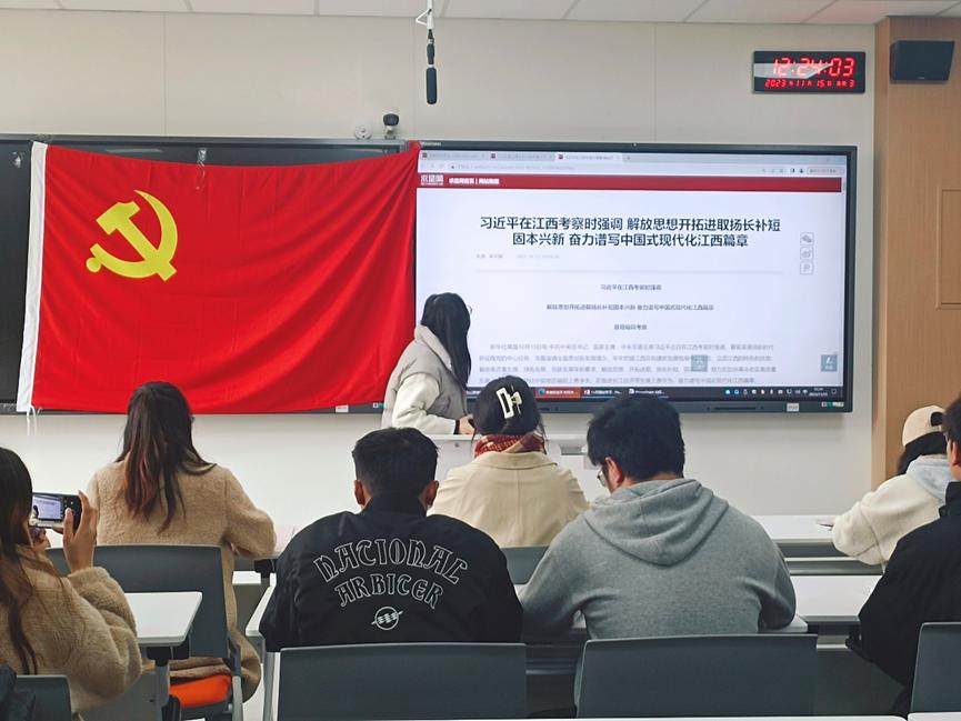 11月16日下午,法學專業學生第三黨支部于博學樓A306集中學習習近平總書記在江西考察時的重要講話精神, “解放思想開拓進取揚長補短固本興新,奮力譜寫中國式現代化江西篇章”,陳佳雨同志領學。