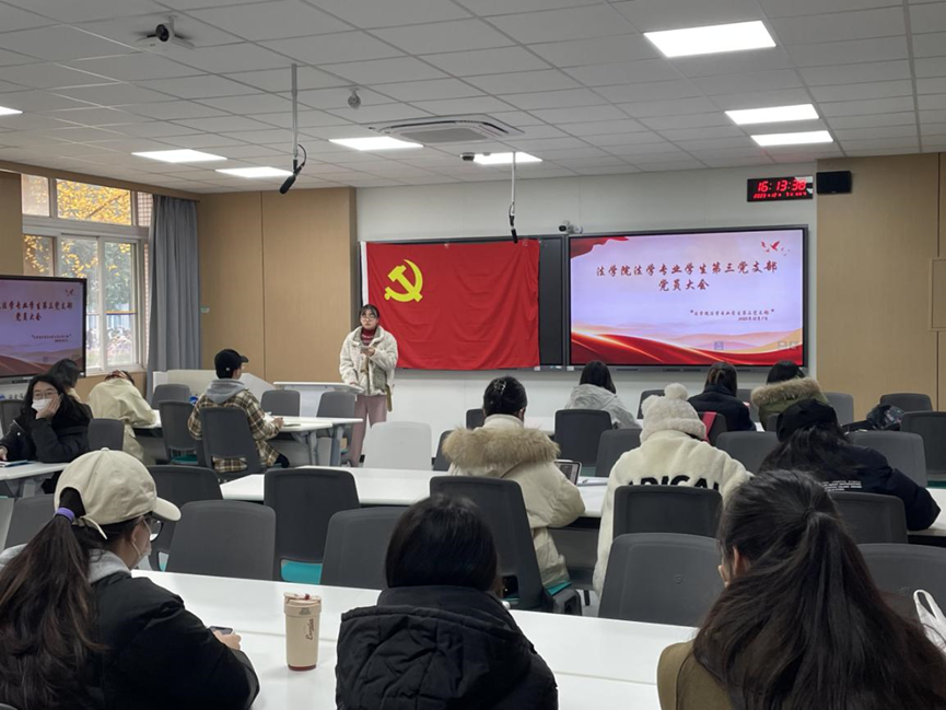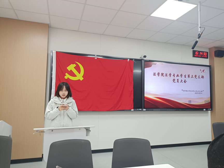 2023年12月8日16時,中共西南石油大學法學院法學專業學生第三黨支部在博學樓A104召開了關于討論閔露丹、張文超、王芊兮、侯富連、賈寒、李洋霄6位預備黨員轉正事宜的黨員大會。會議應到17人,實到17人,因事因病請假黨員0人,支部宋米楊同志主持。