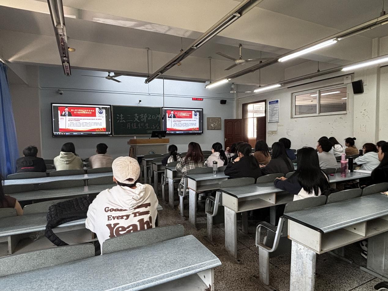 為深入學習2024年全國教育會議精神和關于進一步加強“一站式”學生社區建設黨建引領等四個方面重點工作的通知,2024年3月28日13時,法學專業學生第三黨支部開展了第二次理論學習。會議由齊崇汝同志主講,支部全體同志參加。