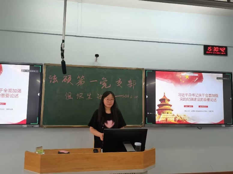 為深入學習貫徹習近平總書記重要講話精神,強化政治理論學習,2024年6月20日,法碩第一黨支部在博學樓A504開展組織生活會,集中深入學習習近平總書記關于全面加強黨的紀律建設的重要論述。本次組織生活會由黨支部副書記代曉玉同志主持。