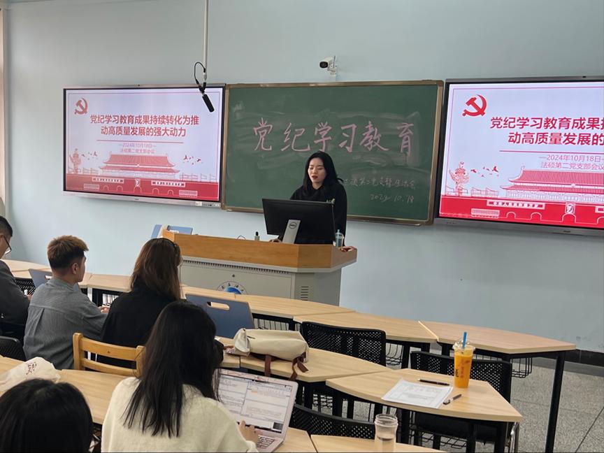 為深入學(xué)習(xí)貫徹習(xí)近平總書記對(duì)黨紀(jì)學(xué)習(xí)教育做出的重要指示。2024年 10 月 18 日,法碩第二黨支部在博學(xué)樓A503 開展主題為“黨紀(jì)學(xué)習(xí)教育成果持續(xù)轉(zhuǎn)化為推動(dòng)高質(zhì)量發(fā)展的強(qiáng)大動(dòng)力”的集中學(xué)習(xí)。本次主題活動(dòng)由黨支部見習(xí)支委李倩同志主持。