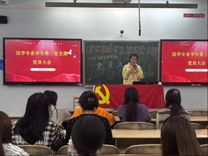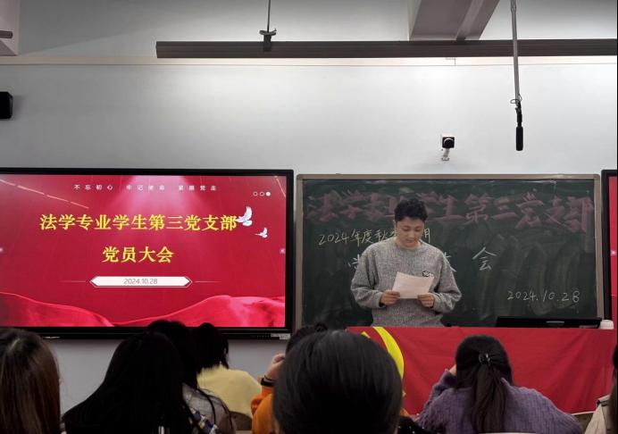 為響應西南石油大學法學院黨委的統一部署和具體要求,努力提升黨建工作活力和黨員黨性修養,2024年10月28日,法學院法學專業學生第三黨支部于思學樓C205教室召開了秋季學期預備黨員發展大會,大會嚴格按照《中國共產黨發展黨員工作細則》的規定進行。