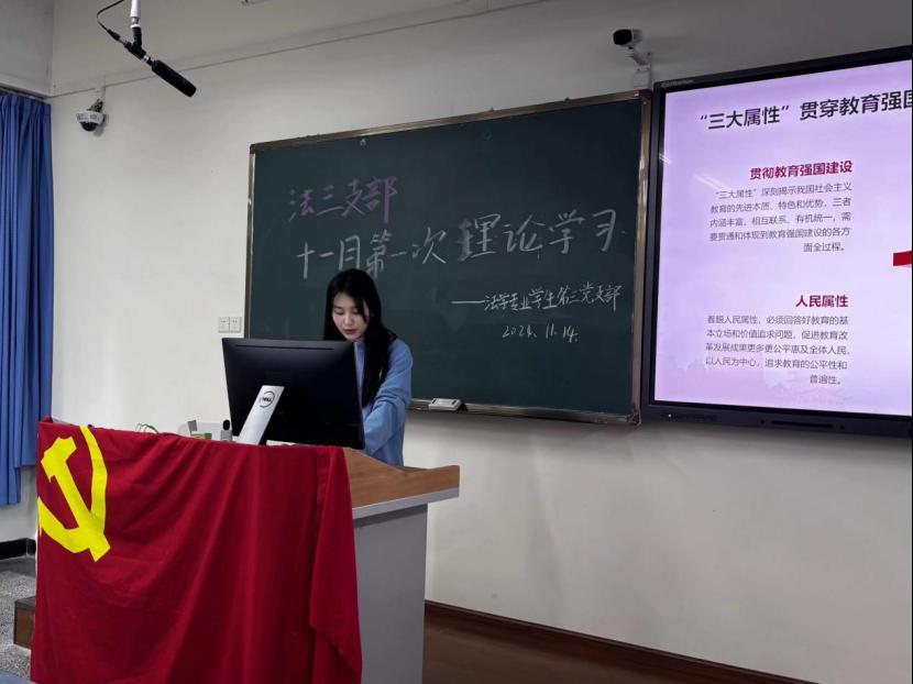 為深入學習貫徹習近平新時代中國特色社會主義思想,2024年11月14日,法學專業學生第三黨支部在博學樓B106召開了11月第一次理論學習會議,本次學習主題為“奮力書寫新時代新征程教育強國建設嶄新篇章”。