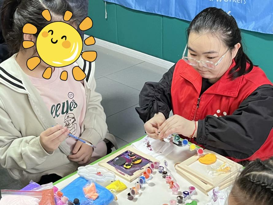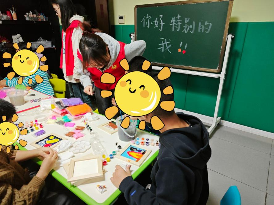 支部同學們協助小朋友們進行自畫像活動——運用黏土、顏料繪制自己的自畫像。小朋友們一筆一劃充滿著純真與期待,用黏土創造,在各自的小相框中繪制心中所想,構筑自己的獨特世界。支部同學在協助小朋友們創造的過程中,有意識引導小朋友分享自身創造理念,提升小朋友表達能力,同時增加學生黨員對殘疾兒童的了解。