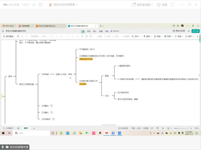 張珍同志曾任法學院秘書處部長、團委秘書長,并擔任班級學習委員,曾獲“優秀學生干部”等榮譽稱號。她以思維導圖的方式清晰展示了她在學生工作方面的豐富經驗。張珍同志詳細闡述了擔任學生會部門委員與班級干部的職責與挑戰,為同學們提供了一份內容豐富的學生工作指南,指導各位同學在學生組織或班級管理中高效開展工作。