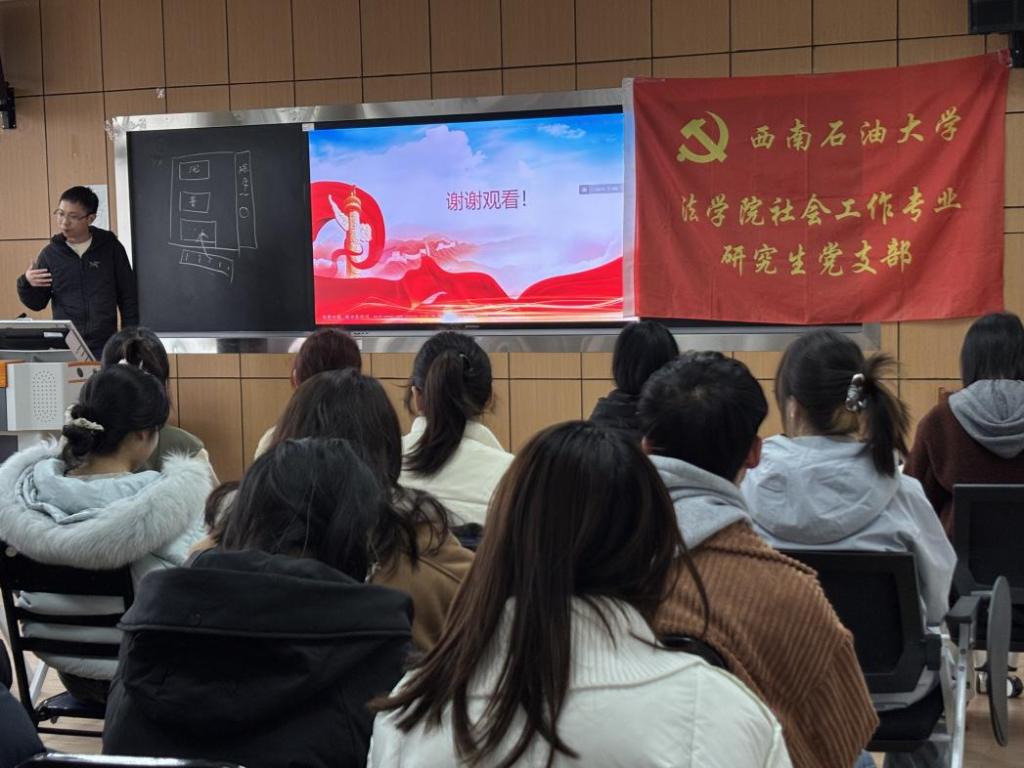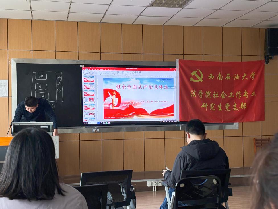 2025年3月6日下午,法學院社會工作研究生黨支部于博學樓A406順利開展黨員學習活動。本次學習以“健全全面從嚴治黨體系”為主題,由施城洋同志擔任匯報人,全體黨員積極參與。