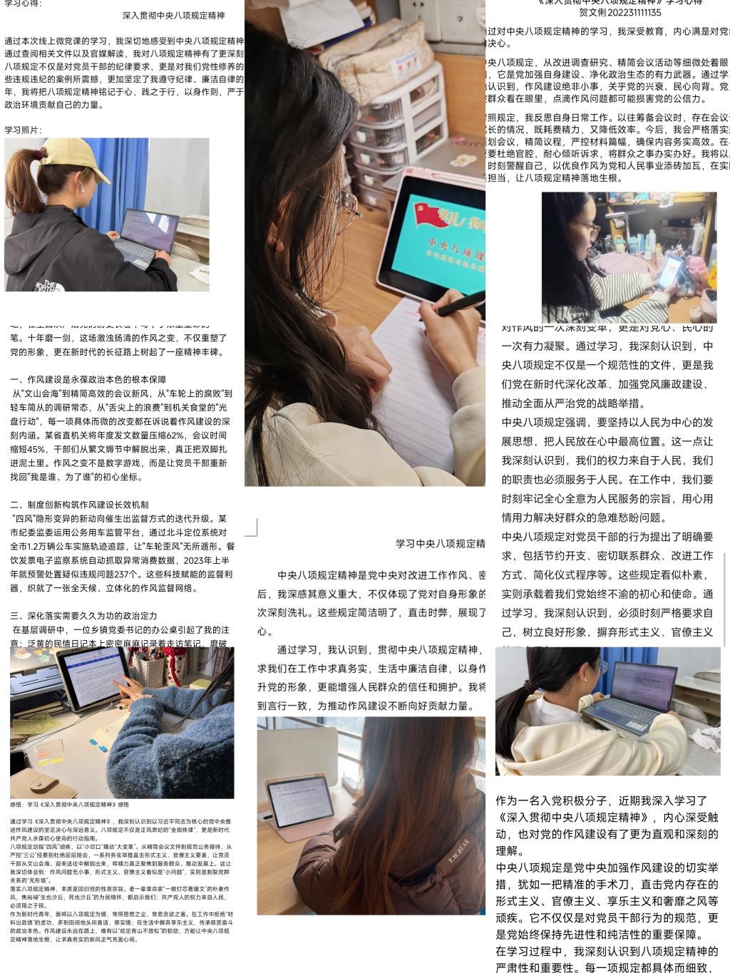 通過本次學習,支部成員紛紛表示深受教育。大家認識到,作為新時代的青年黨員,要把貫徹中央八項規定精神作為長期堅持的自覺行動。從自身做起,從小事做起,嚴格要求自己,堅決抵制形式主義、官僚主義、享樂主義和奢靡之風,時刻保持清醒頭腦,做到廉潔自律。同時,還要積極發揮黨員的先鋒模范作用,帶動身邊同學共同營造風清氣正的良好氛圍。