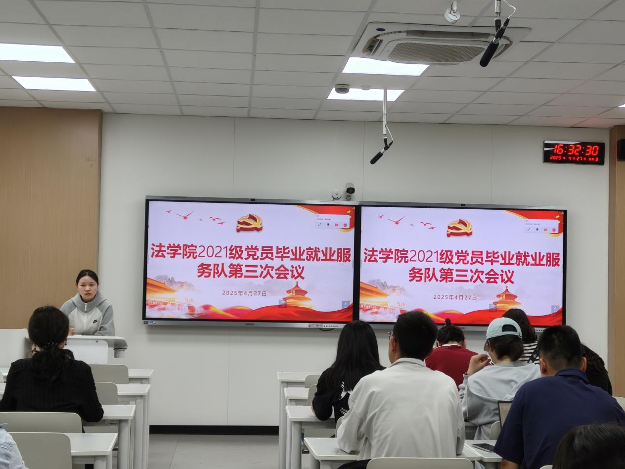 2025年4月27日下午,法學(xué)院2021級黨員畢業(yè)就業(yè)服務(wù)隊第三次會議在博學(xué)樓B207召開。會議由2021級兼職輔導(dǎo)員肖燦老師主持,全體服務(wù)隊黨員參會。