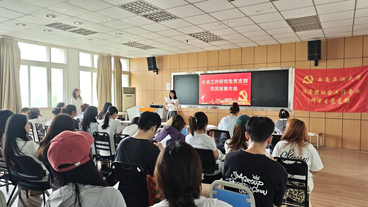 2025年5月15日星期四下午三點,西南石油大學法學院社工研究生黨支部在博學樓A406教室召開了黨員大會。本次會議由鮮雨洛同志主持,會議有兩項議程,內容充實且意義深遠。