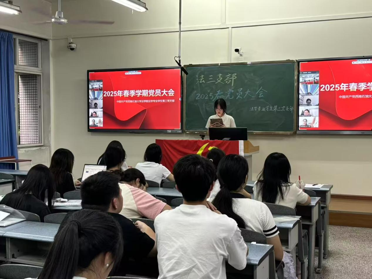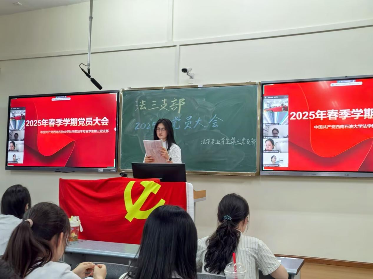 為響應西南石油大學法學院黨委的統一部署和具體要求,努力提升黨建工作活力和黨員黨性修養,2025年5月22日,法學院法學專業學生第三黨支部于博學樓B303教室召開了春季學期預備黨員發展大會,大會嚴格按照《中國共產黨發展黨員工作細則》的規定進行。