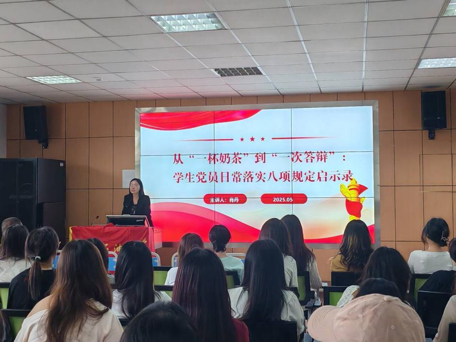 會議開場,肖丹書記立足Z世代學生特性,深入解讀八項規定的歷史背景與時代價值。她指出,新時代學生黨員成長于互聯網浪潮中,個性鮮明、追求創新,但更應以八項規定為行動圭臬,將“改進工作作風、厲行勤儉節約、密切聯系群眾”等核心要求融入校園生活的點滴。