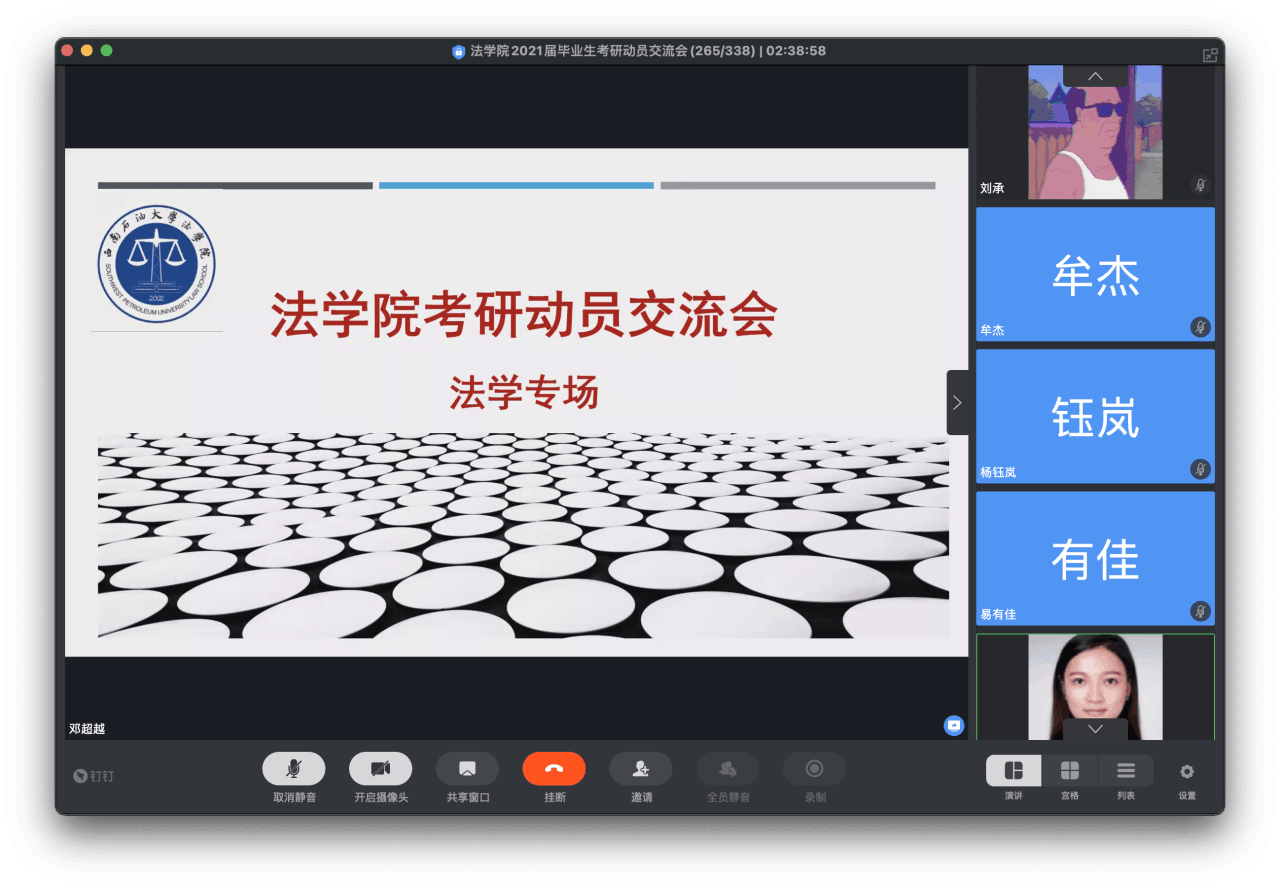 為幫助學(xué)生全面了解研究生考試的政策與形勢,進(jìn)一步掌握備考應(yīng)考方法,法學(xué)院于7月2日下午15點(diǎn)在線上開展2021屆考研動員交流會,本次交流會分為社工專場以及法學(xué)專場,邀請到了法學(xué)院副院長譚祖雪、傅晶晶兩位老師擔(dān)任主講老師,以及四位2016級考研成功的優(yōu)秀學(xué)子為大家分享考研經(jīng)驗(yàn)。