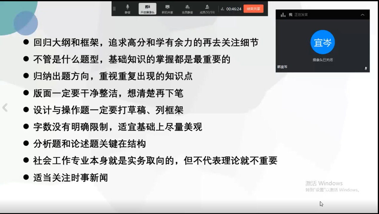 社會工作專業(yè)的何寅培同學為考生們分享了他的專業(yè)課經(jīng)驗,強調了目前階段應重視考試大綱,并介紹了名詞解釋、案例分析、論述題等不同題型的答題技巧。李好同學介紹了專業(yè)課的“細”“略”學習方法,“細”在把握小知識點,“略”在掌握章節(jié)間及章節(jié)的內部邏輯。胡婉玲同學告訴考生要整理專業(yè)課框架,讓知識性有邏輯、成體系,才能應對各種題型,并介紹了一些緩解壓力的辦法。