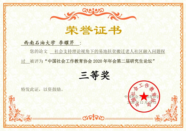 近日,中國社會(huì)工作教育協(xié)會(huì)公布了“全國社會(huì)工作教育協(xié)會(huì)2020年年會(huì)第二屆研究生論壇”的獲獎(jiǎng)名單,我院2020級(jí)社會(huì)工作專業(yè)研究生李耀芹同學(xué)撰寫的論文《社會(huì)支持理論視角下易地扶貧搬遷老人社區(qū)融入的問題探討》在茹婧導(dǎo)師的指導(dǎo)下,喜獲三等獎(jiǎng)。