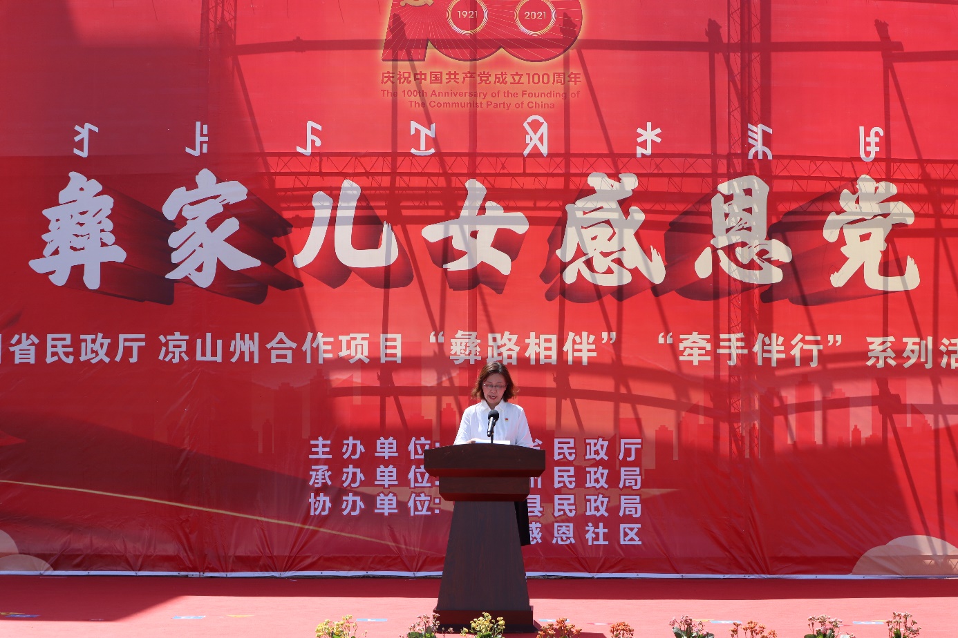 6月28日,四川省民政廳、涼山州合作項目“彝路相伴”“牽手伴行”系列活動——“彝家兒女感恩黨”,在涼山州越西縣感恩社區舉行。四川省民政廳胡建林副廳長、楊伯明巡視員,涼山州副州長李華、州委組織部長劉曉博等領導出席活動,我校法學院副院長譚祖雪教授作為廳州校社四方聯動方6所高校的代表,應邀出席活動并代表高校發言。