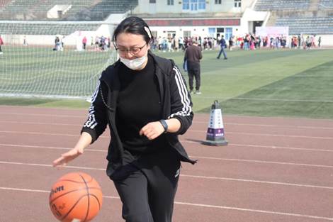 法學院工會于操場設置了“障礙運球”項目,輪流進行著運球項目,靈活地通過了障礙物并順利地返回。即使少部分老師對于球類接觸的不多,在運球時有些許不嫻熟,老師們依然熱情高昂,運動場上加油聲、歡笑聲此起彼伏。
